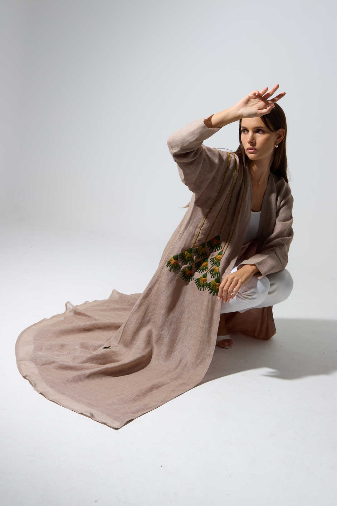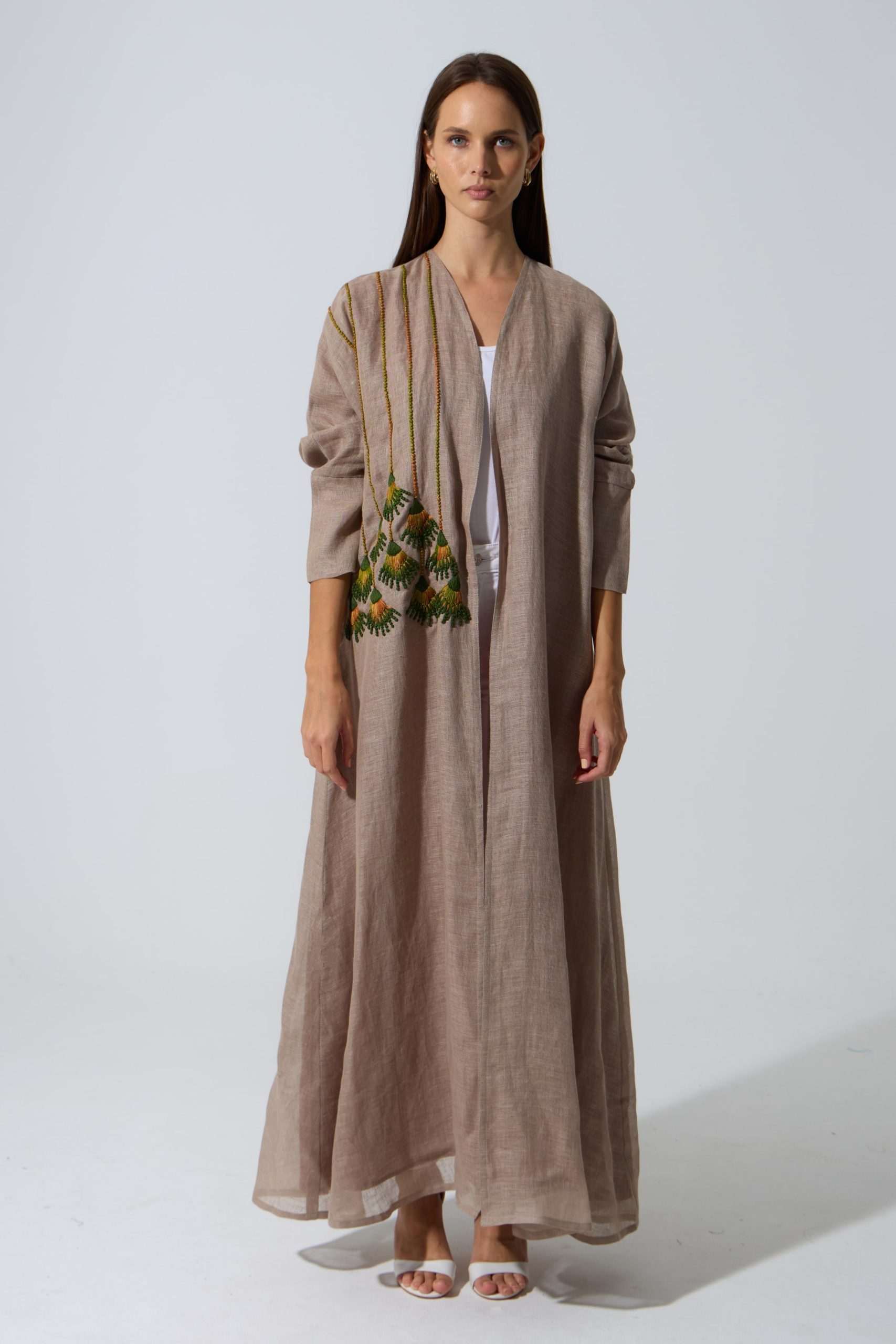 Crafted from Indian sheer Linen with a contrasting chiffon Lining underneath, This Abaya is cut to a flattering A-line silhouette.