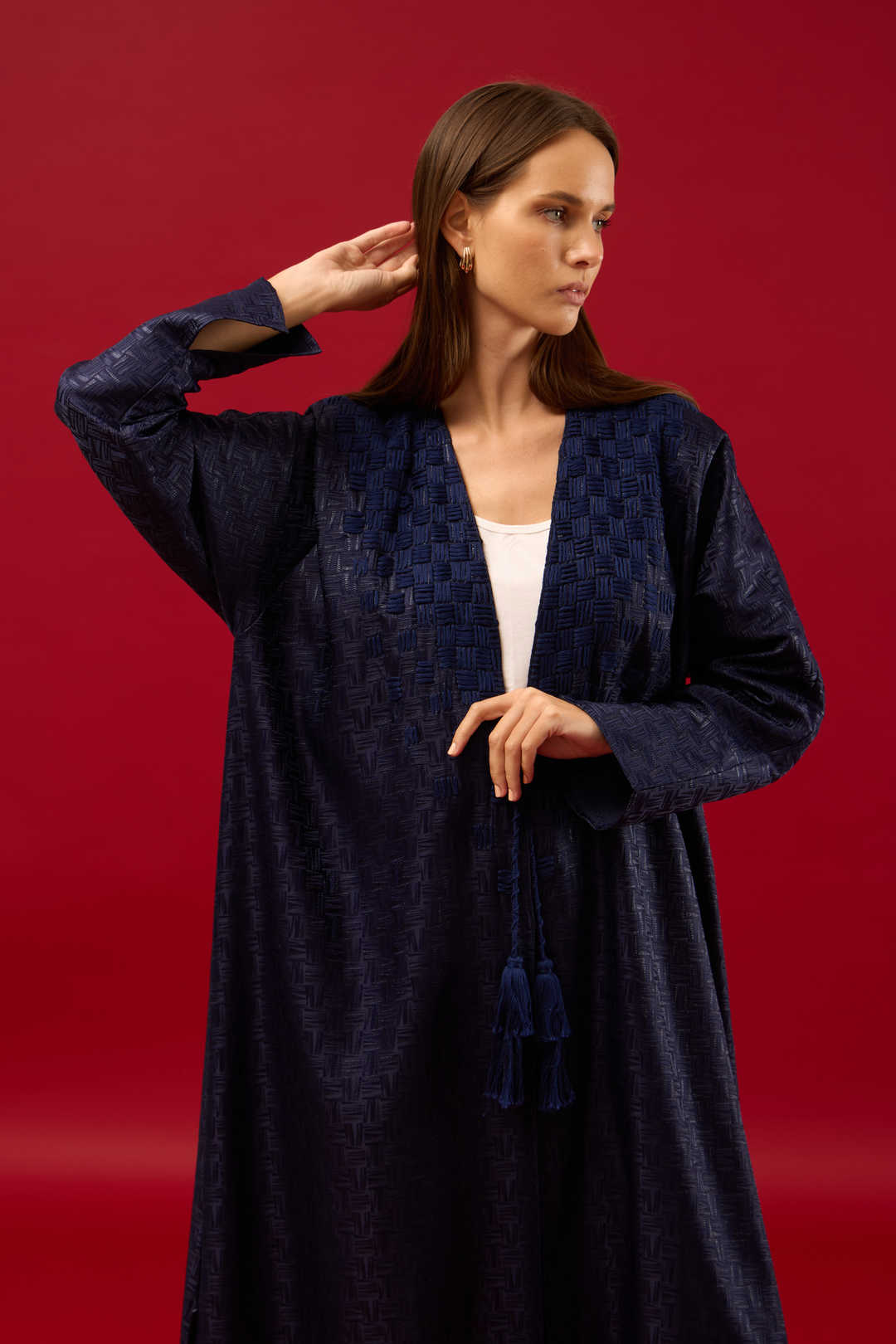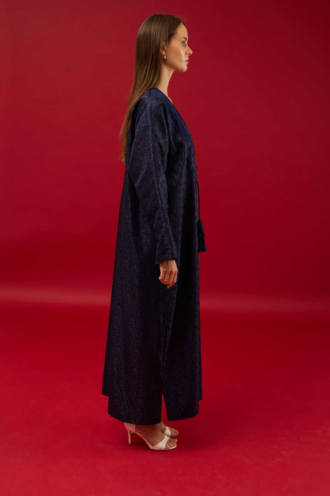 This enveloping straight-cut Abaya is made from two-tone jacquard fabric with textured design of Intreccio-like pattern.