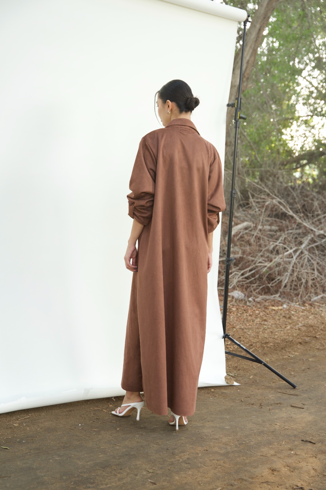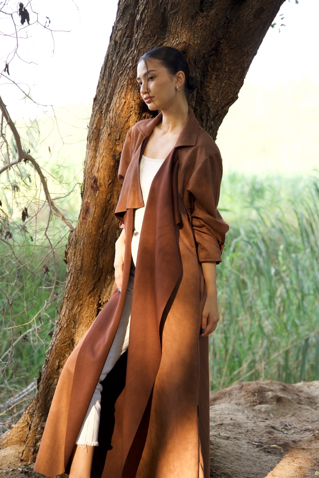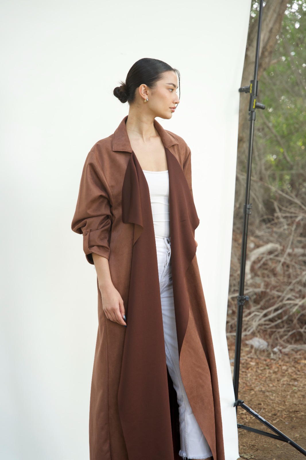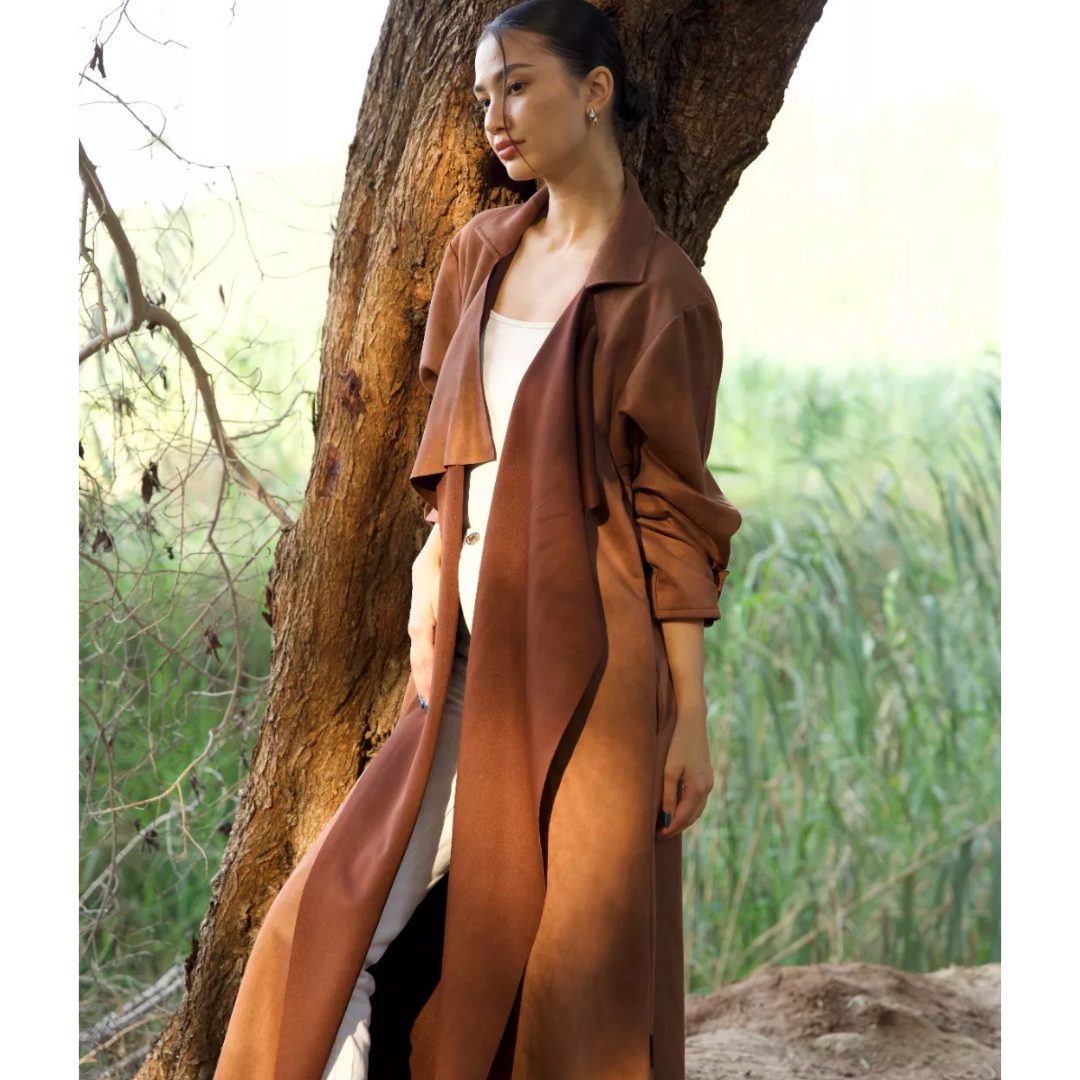 Made with two-toned Suede Fabric This minimalist design is elevated with draped waterfall collar and Adjustable roll-up Sleeves.
